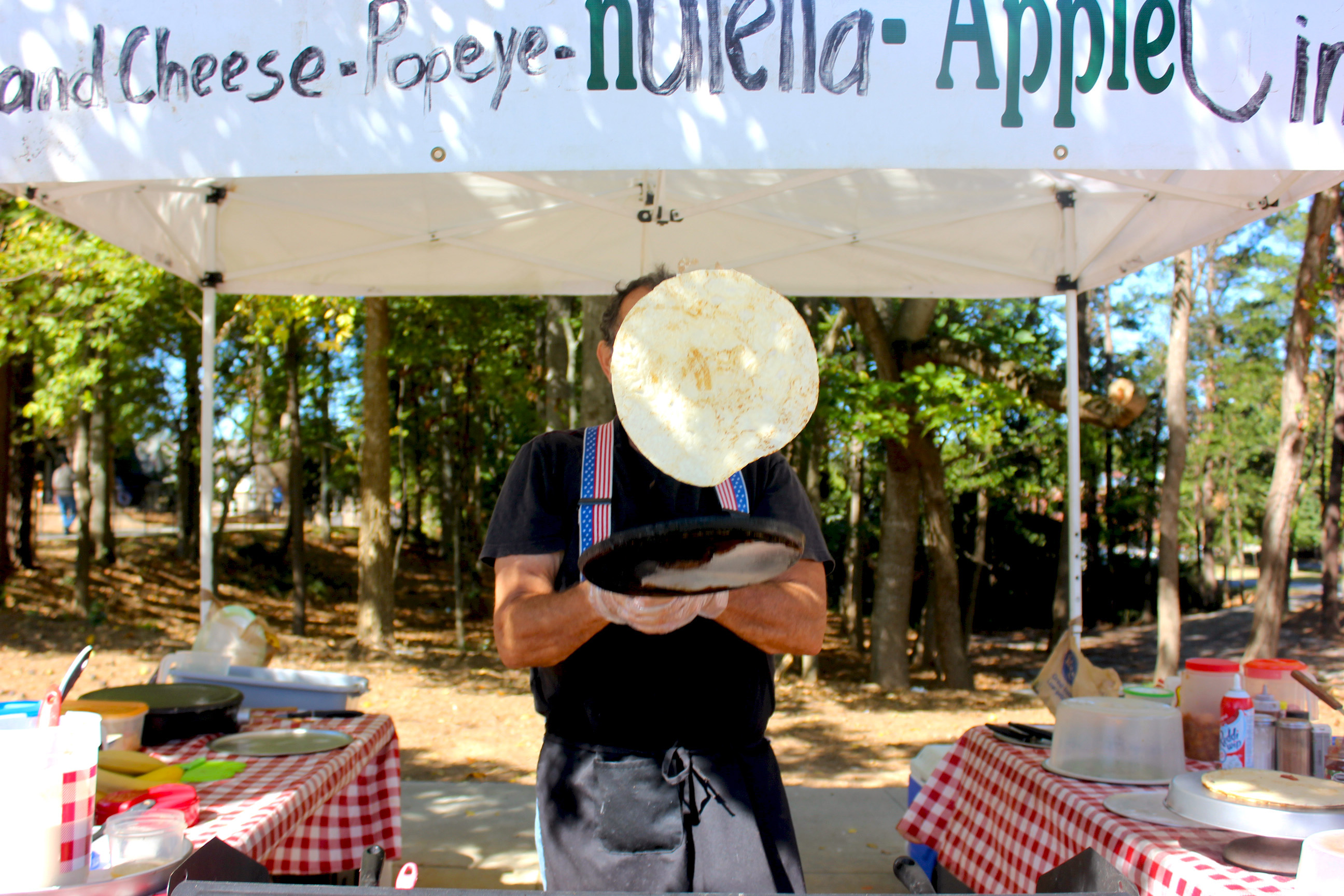 A man flips a crepe into the air as he prepares a customer’s order at the Woodstock Farmer’s Market on Oct. 8, 2016. This was one of the last farmer’s markets of the season in Woodstock, Ga.